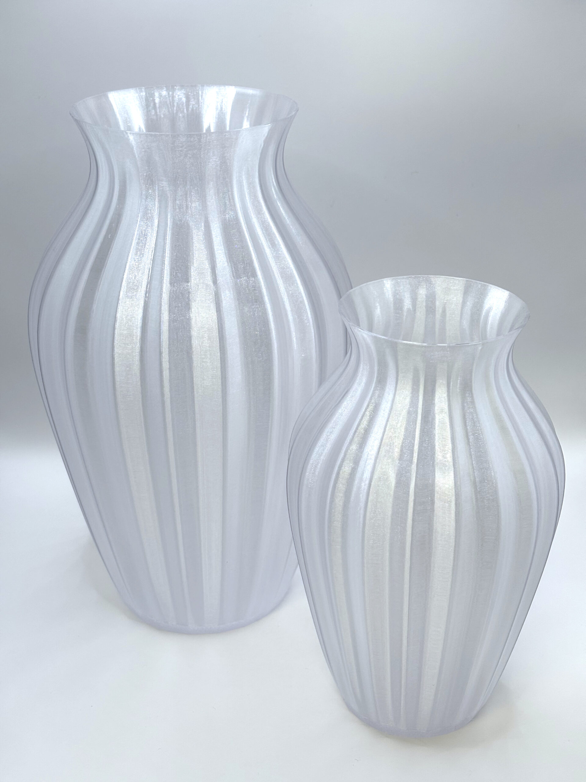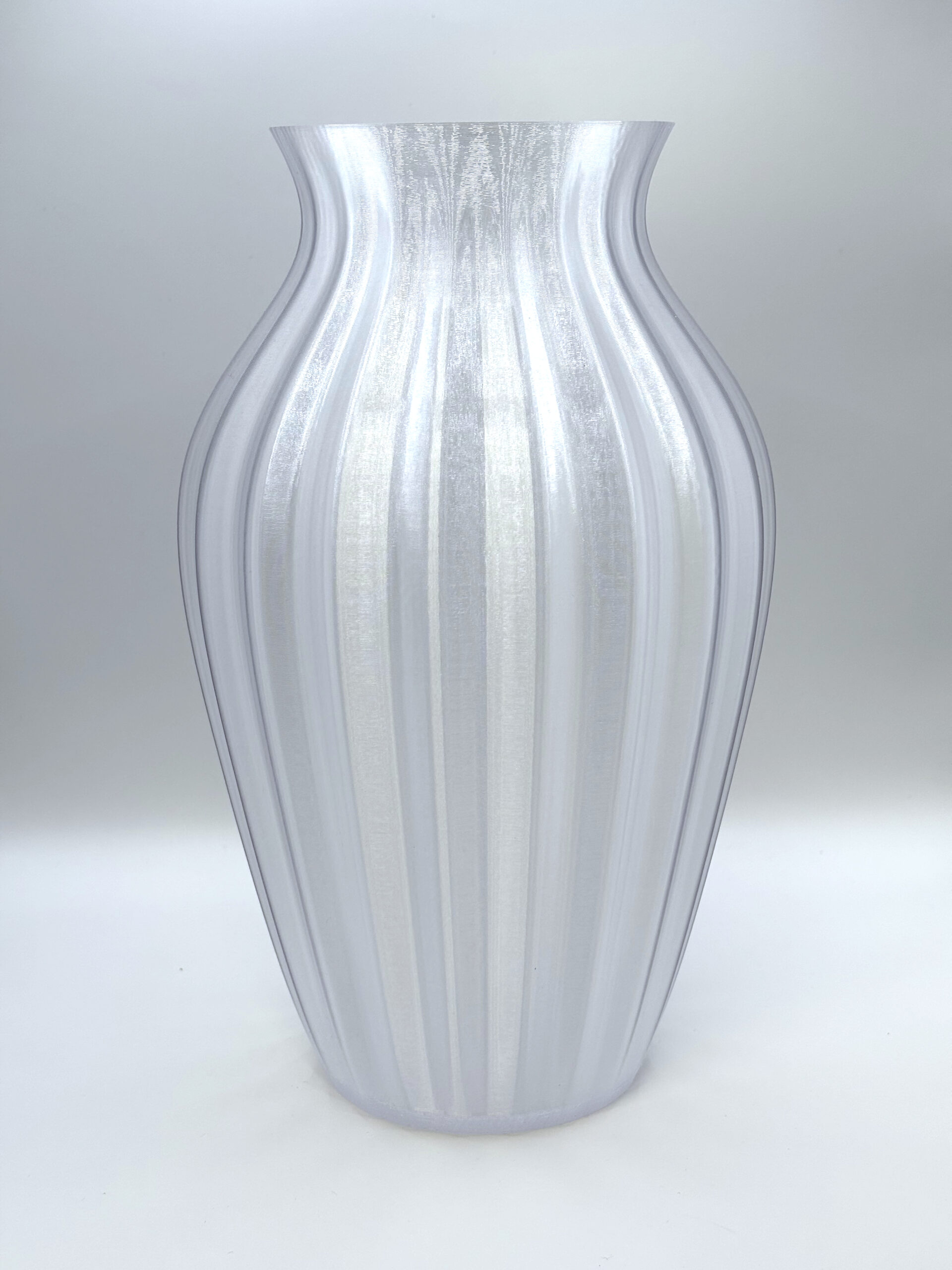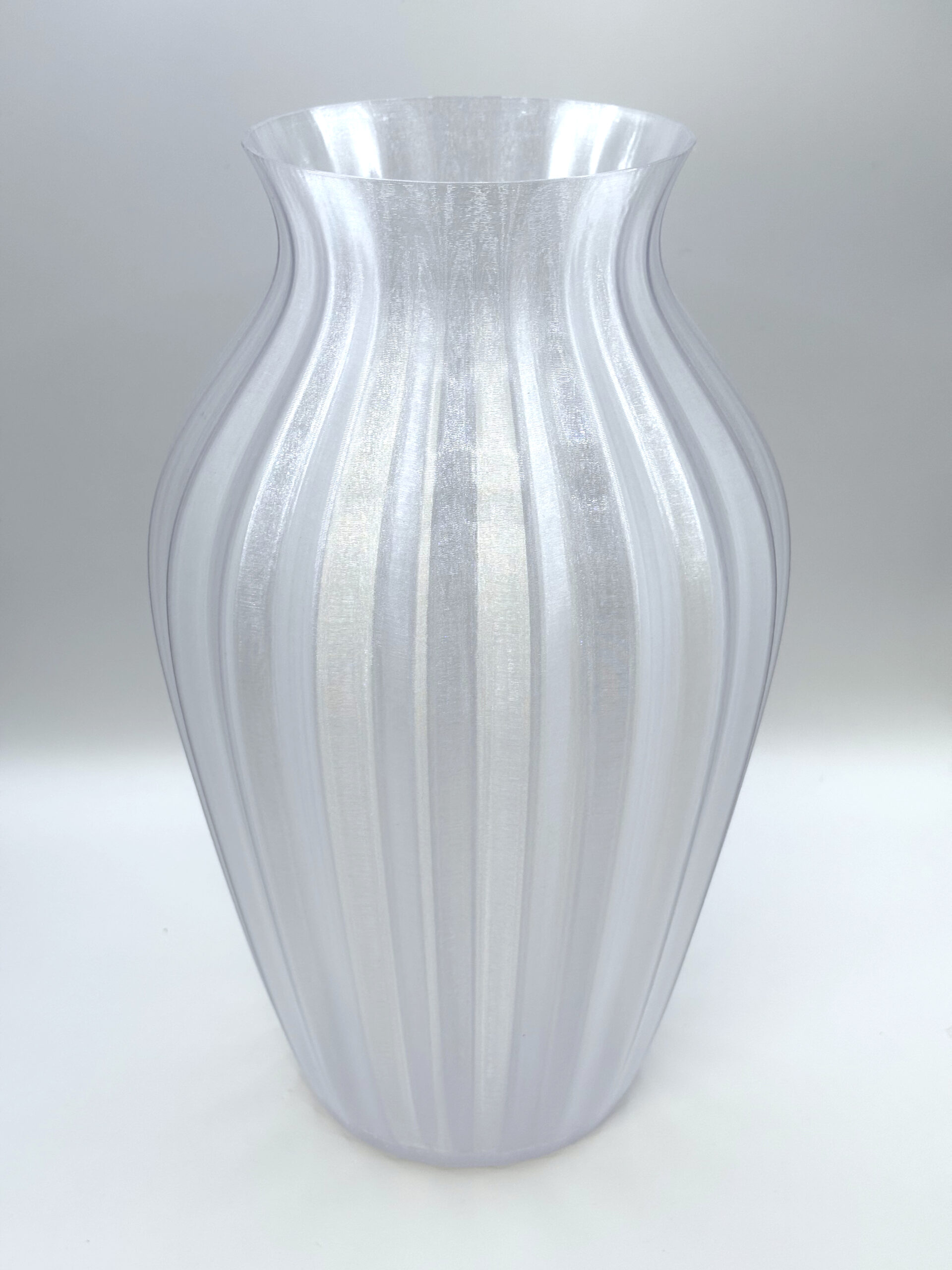 Vasen har med sin gennemsigtige plastik perlemorseffekt, som reflekterer lyset smukt fra alle vinkler. Den egner sig perfekt til både tørrede/kunstige blomster og dekorativ brug alene – og tilfører et moderne og stilrent element til enhver indretning.